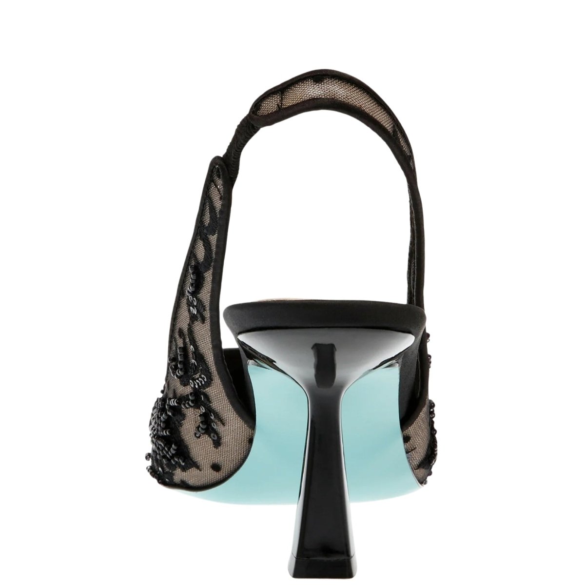 Hand applied beads and sequins form intricate floral patterns over fine mesh, adding texture and subtle dimension while maintaining a delicate finish. The pointed toe enhances the streamlined shape, while the sculpted heel offers balanced height and stability.